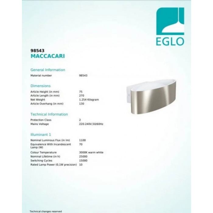 В нашому інтернет супермаркеті кращого освітлення з Європи та України Electroled.com.ua ви можете купити Бра Eglo MACCACARI 98543 від торгової марки Eglo.