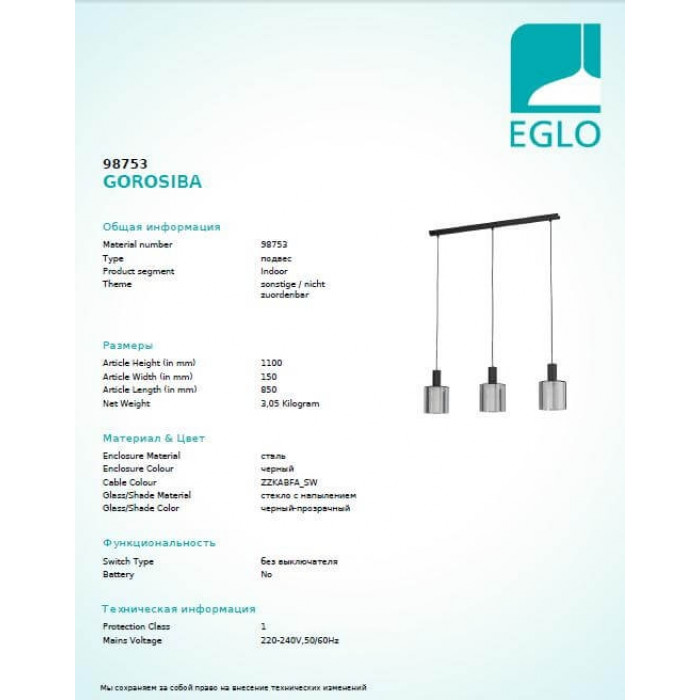 В нашому інтернет супермаркеті кращого освітлення з Європи та України Electroled.com.ua ви можете купити Люстра Eglo GOROSIBA 98753 від торгової марки Eglo.