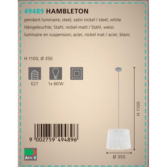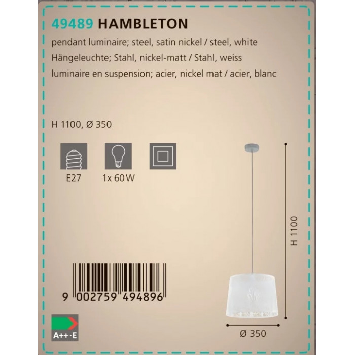В даній категорії - Підвісні світильники - наша компанія Electroled.com.ua представляє Eglo. Такий світловий прилад - Люстра Eglo HAMBLETON 49489 цікаво доповнить ваш дизайнерський інтер'єр.