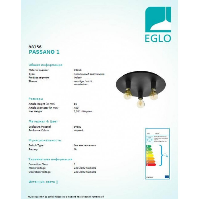 В нашому інтернет супермаркеті кращого освітлення з Європи та України Electroled.com.ua ви можете купити Люстра Eglo PASSANO 1 98156 від торгової марки Eglo.