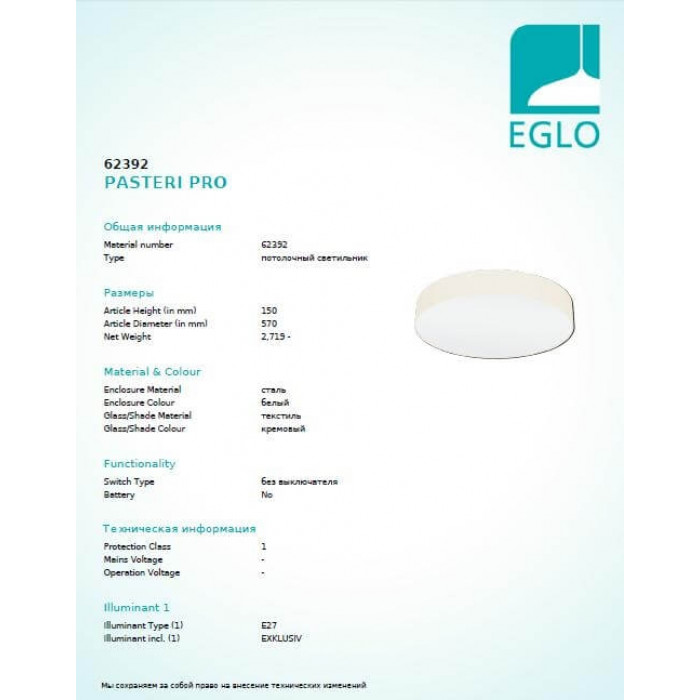 В нашому інтернет супермаркеті кращого освітлення з Європи та України Electroled.com.ua ви можете купити Люстра Eglo PASTERI PRO 62392 від торгової марки Eglo.