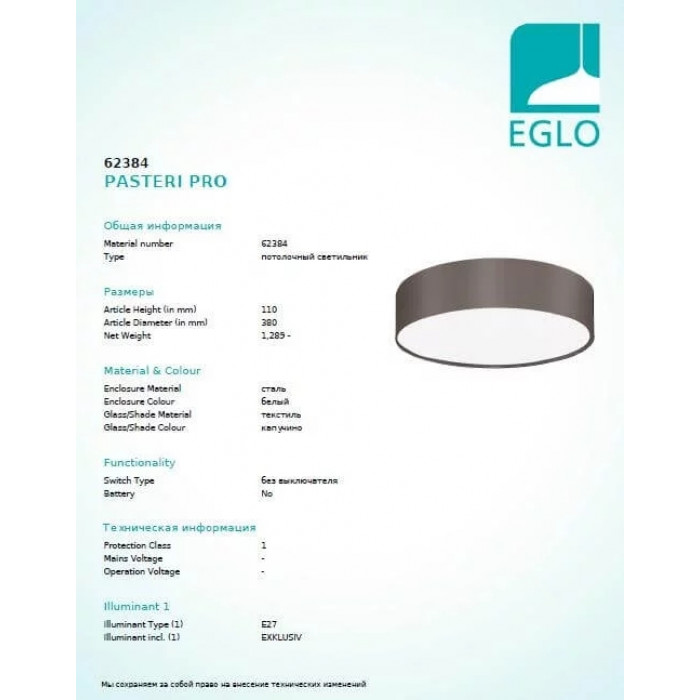 В даній категорії - Брендові люстри - наша компанія Electroled.com.ua представляє Eglo. Такий світильник - Люстра Eglo PASTERI PRO 62393 цікаво доповнить ваш дизайнерський інтер'єр.