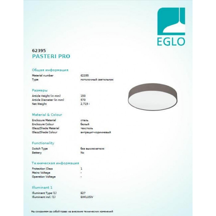 В даній категорії - Брендові люстри - наша компанія Electroled.com.ua представляє Eglo. Такий освітлювальний прилад - Люстра Eglo PASTERI PRO 62395 цікаво доповнить ваш дизайнерський інтер'єр.