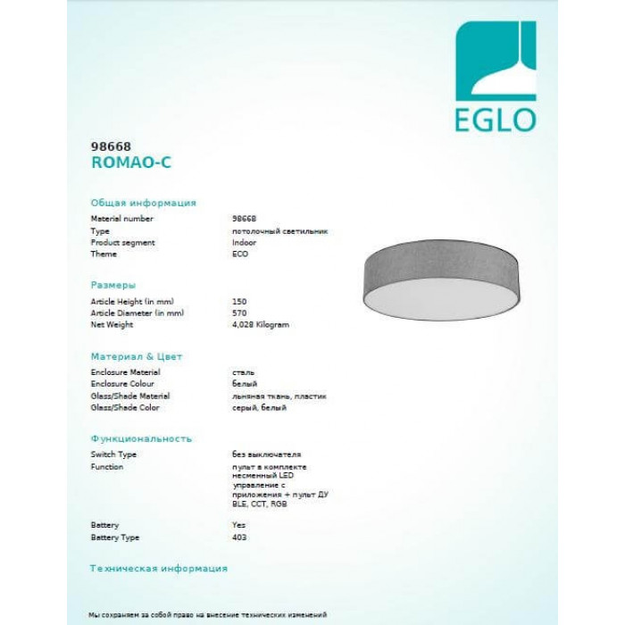 Теги: Брендові люстри, Eglo, модуль LED, метал, текстіль, так, сірий і відтінки