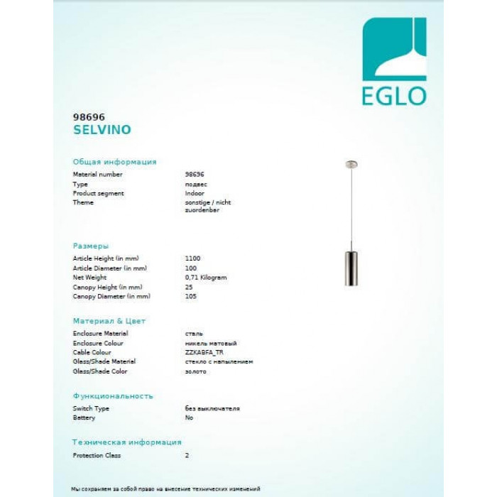 В даній категорії - Підвісні світильники - наша компанія Electroled.com.ua представляє Eglo. Такий світильник - Люстра Eglo SELVINO 98696 цікаво доповнить ваш дизайнерський інтер'єр.