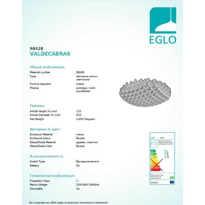 В нашому інтернет супермаркеті кращого освітлення з Європи та України Electroled.com.ua ви можете купити Люстра Eglo VALDECABRAS 98428 від торгової марки Eglo.