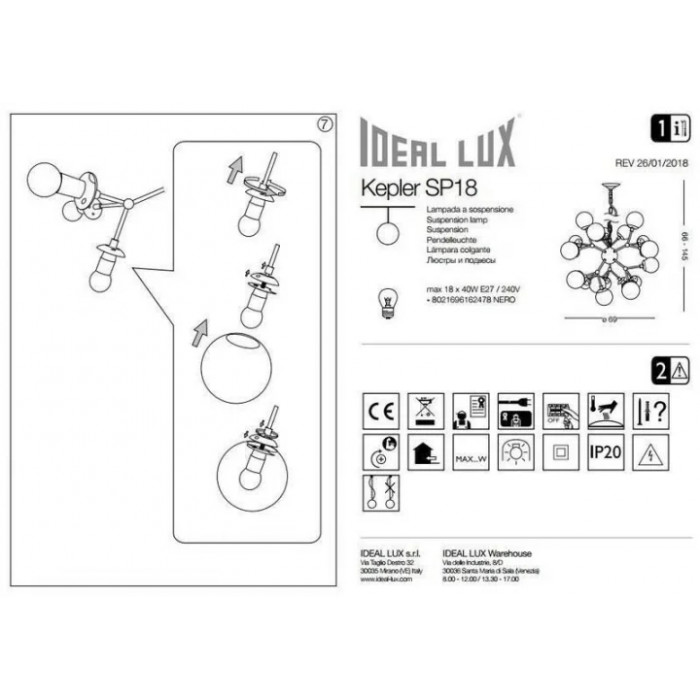 В даній категорії - Підвісні світильники - наша компанія Electroled.com.ua представляє Ideal Lux. Такий освітлювальний прилад - Люстра Ideal Lux KEPLER 162478 цікаво доповнить ваш дизайнерський інтер'єр.