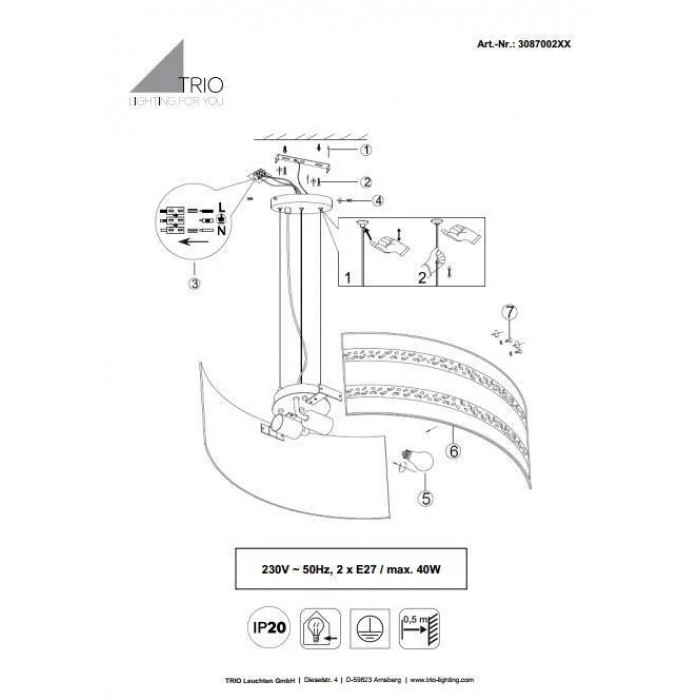 В даній категорії - Підвісні світильники - наша компанія Electroled.com.ua представляє Trio. Такий освітлювальний прилад - Люстра TRIO NIKOSIA 308700289 цікаво доповнить ваш дизайнерський інтер'єр.