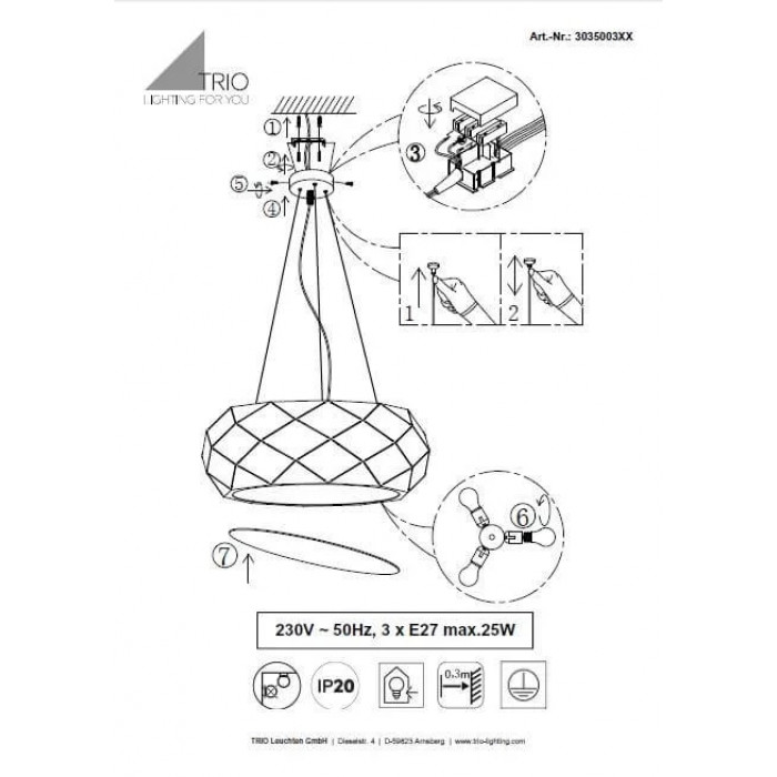 В даній категорії - Підвісні світильники - наша компанія Electroled.com.ua представляє Trio. Такий освітлювальний прилад - Люстра TRIO ZANDOR 303500331 цікаво доповнить ваш дизайнерський інтер'єр.