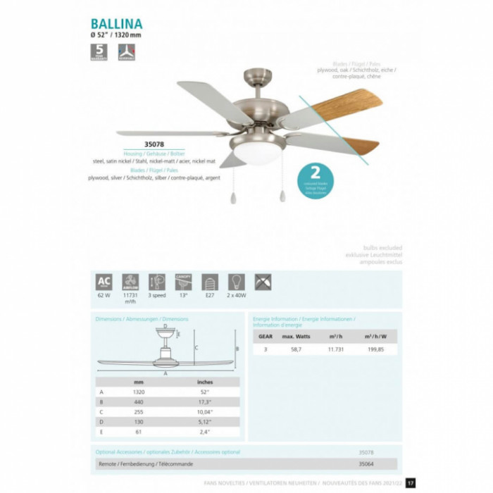 В нашому інтернет супермаркеті кращого освітлення з Європи та України Electroled.com.ua ви можете купити Люстра-вентилятор Eglo BALLINA 35078 від торгової марки Eglo.