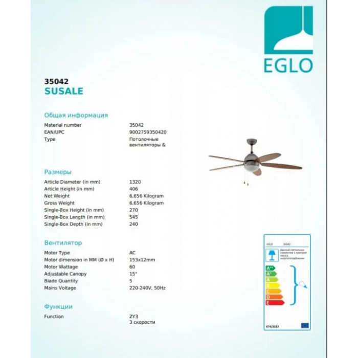 В нашому інтернет супермаркеті кращого освітлення з Європи та України Electroled.com.ua ви можете купити Люстра-вентилятор Eglo SUSALE 35042 від торгової марки Eglo.