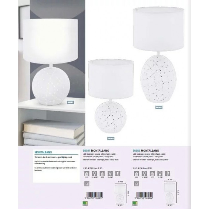 В даній категорії - Настільні лампи та нічники - наша компанія Electroled.com.ua представляє Eglo. Такий світильник - Настільна лампа Eglo MONTALBANO 98381 цікаво доповнить ваш дизайнерський інтер'єр.