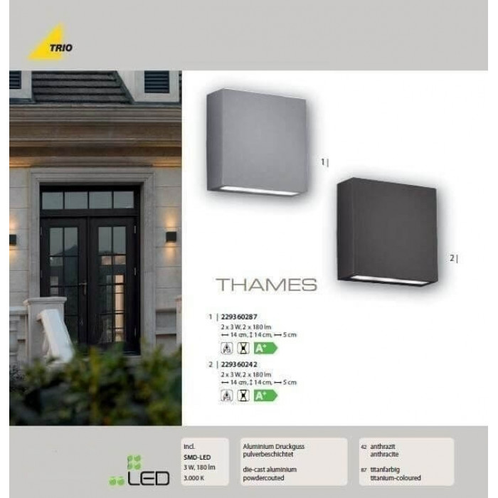 В нашому інтернет супермаркеті кращого освітлення з Європи та України Electroled.com.ua ви можете купити Настінний вуличний світильник TRIO THAMES 229360287 від торгової марки Trio.