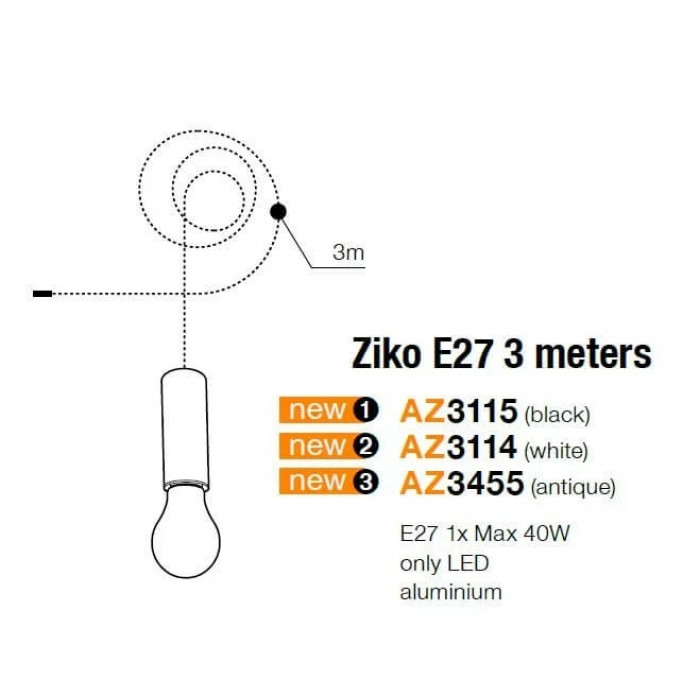В даній категорії - Підвісні світильники - наша компанія Electroled.com.ua представляє Azzardo. Такий світильник - Патрон зі шнуром AZzardo ZIKO E27 3 meters AZ3115 цікаво доповнить ваш дизайнерський інтер'єр.