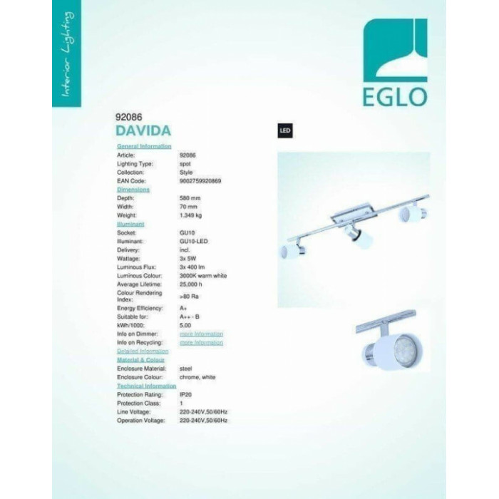 В нашому інтернет супермаркеті кращого освітлення з Європи та України Electroled.com.ua ви можете купити Стельовий світильник Eglo Davidа 92086 від торгової марки Eglo.