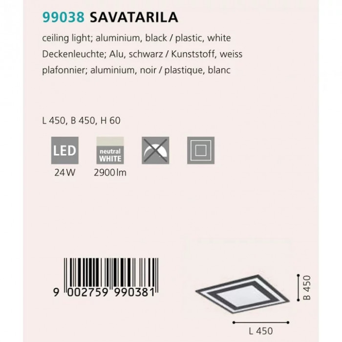В нашому інтернет супермаркеті кращого освітлення з Європи та України Electroled.com.ua ви можете купити Стельовий світильник Eglo SAVATARILA 99038 від торгової марки Eglo.