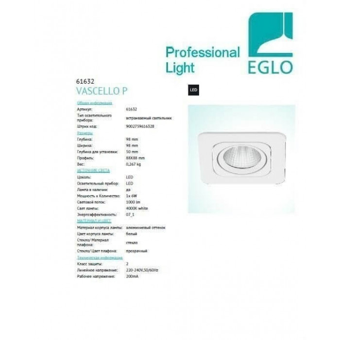 В нашому інтернет супермаркеті кращого освітлення з Європи та України Electroled.com.ua ви можете купити Точковий світильник Eglo VASCELLO P 61632 від торгової марки Eglo.