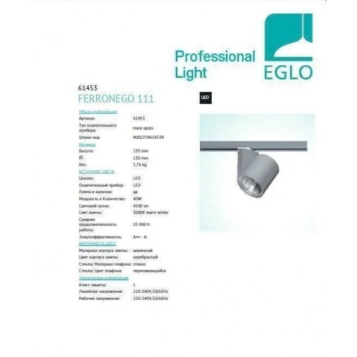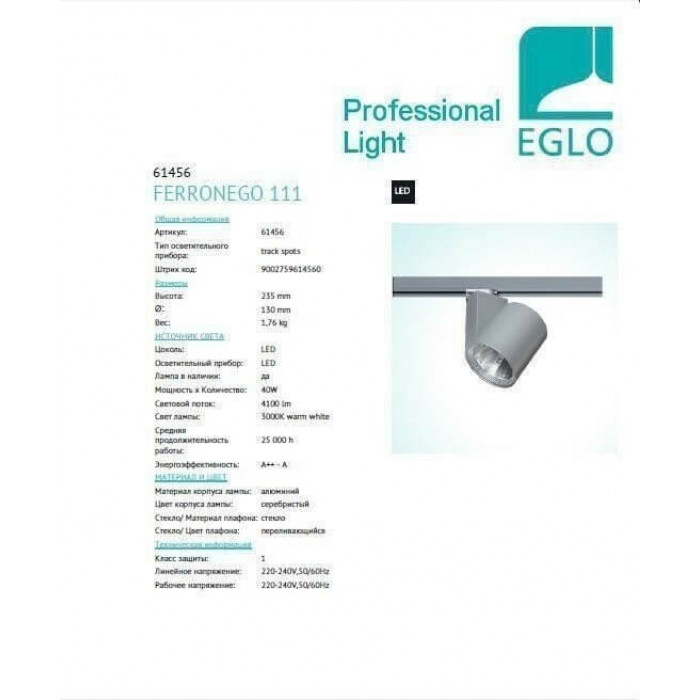 В нашому інтернет супермаркеті кращого освітлення з Європи та України Electroled.com.ua ви можете купити Трековий світильник Eglo FERRONEGO 111 61456 від торгової марки Eglo.