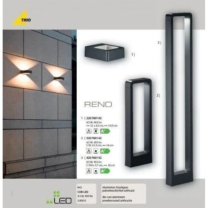 В нашому інтернет супермаркеті кращого освітлення з Європи та України Electroled.com.ua ви можете купити Вуличний ліхтар TRIO RENO 420760142 від торгової марки Trio.